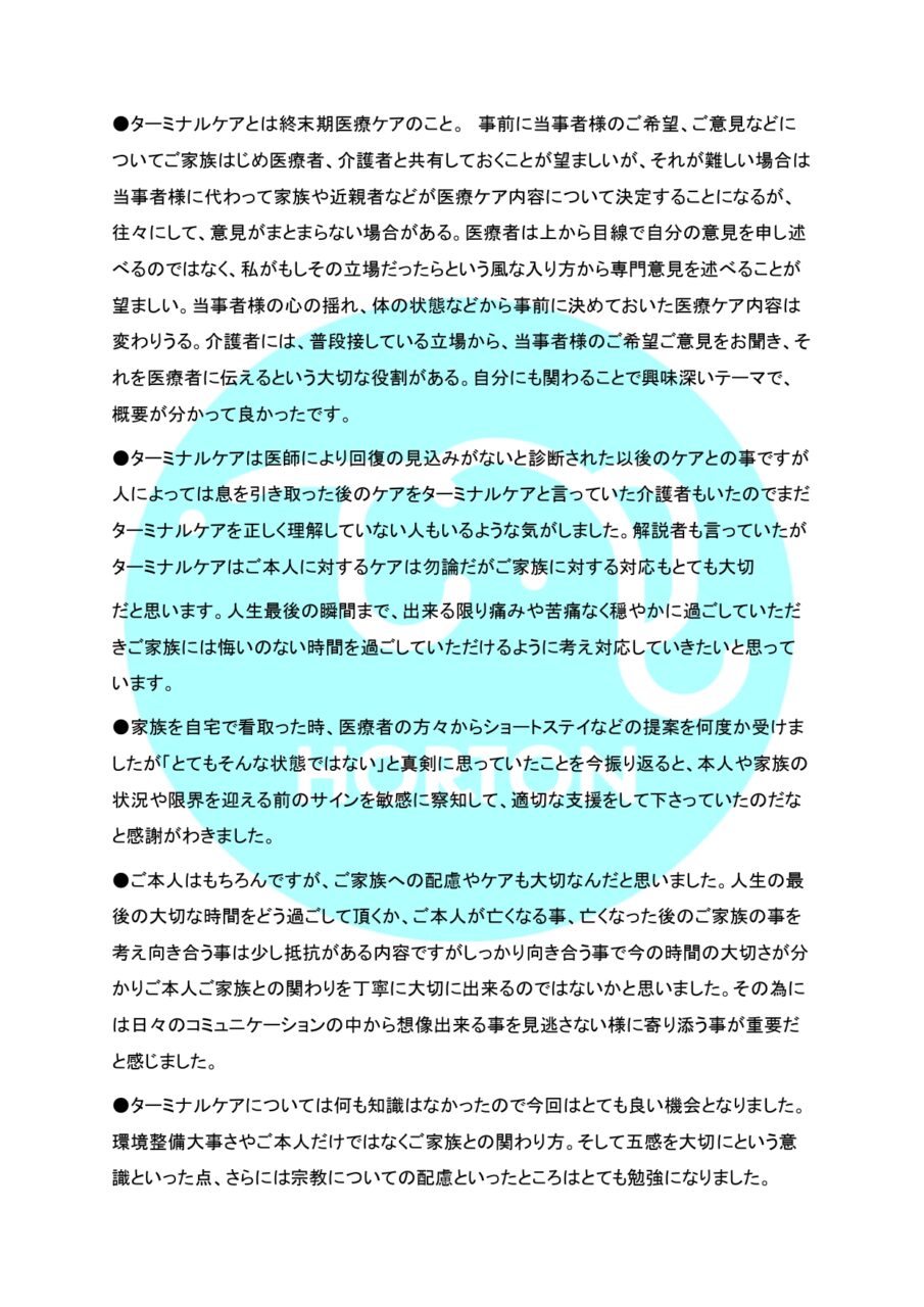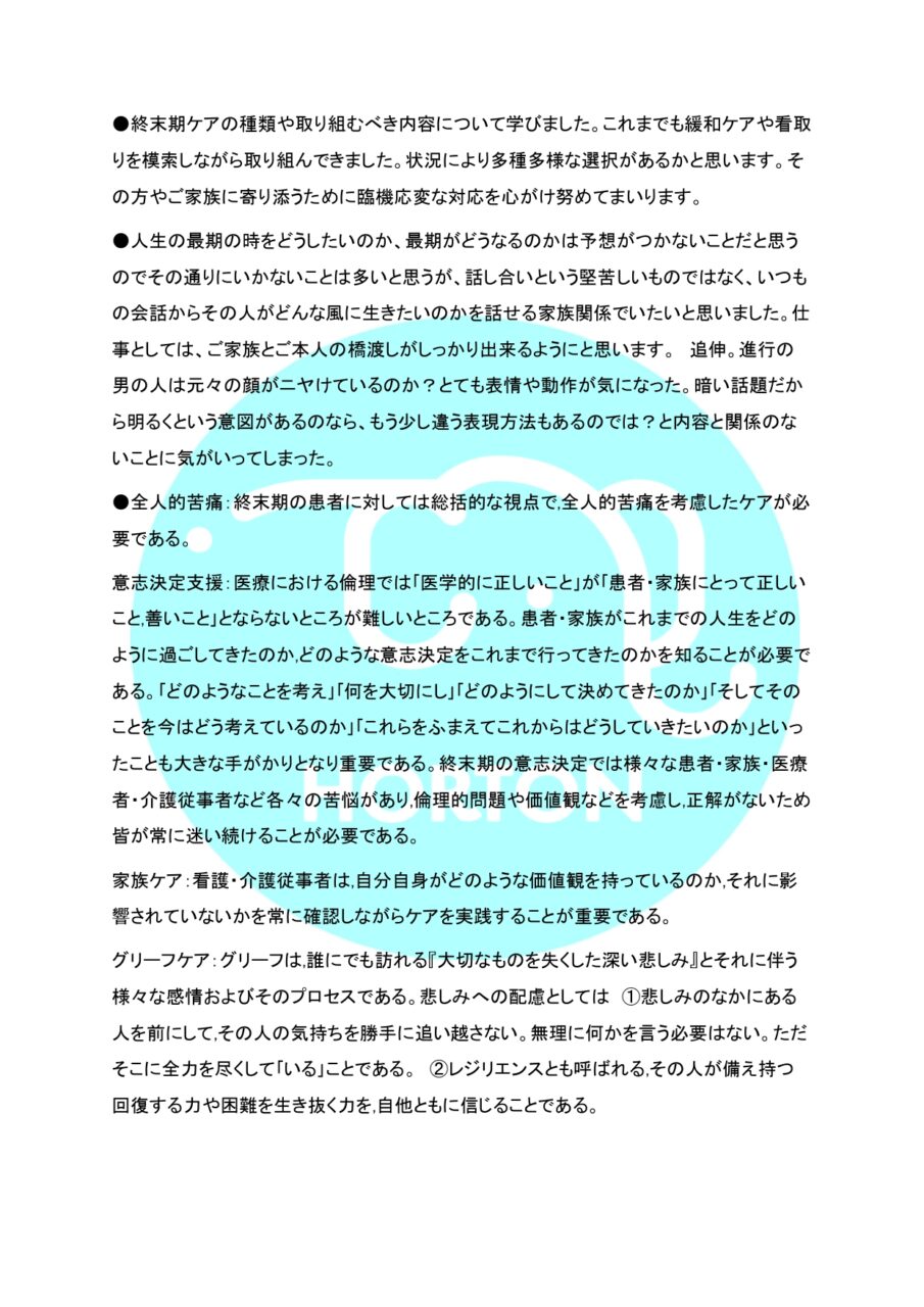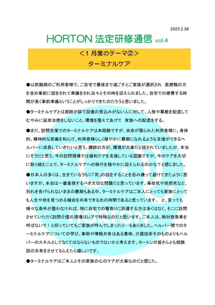 HORTON 法定研修通信 vol.5 § ターミナルケア ホーム » HORTON 法定研修通信 vol.5 § ターミナルケア 2026.2.9 HORTON 個別研修通信 vol.5【Group C】 公開日 : 2026-2-28 最終更新日 : 2026-2-28 ホートンの研修